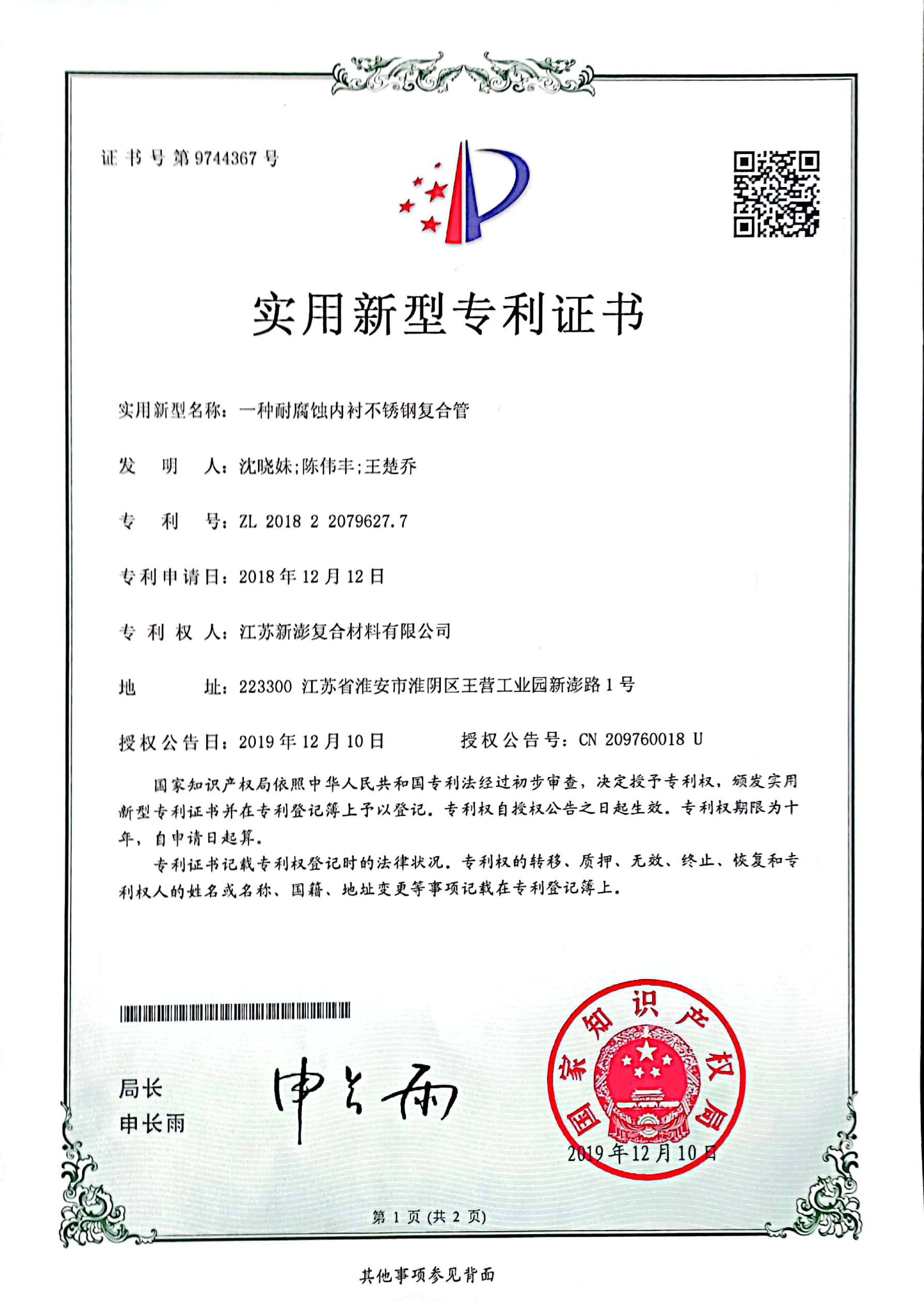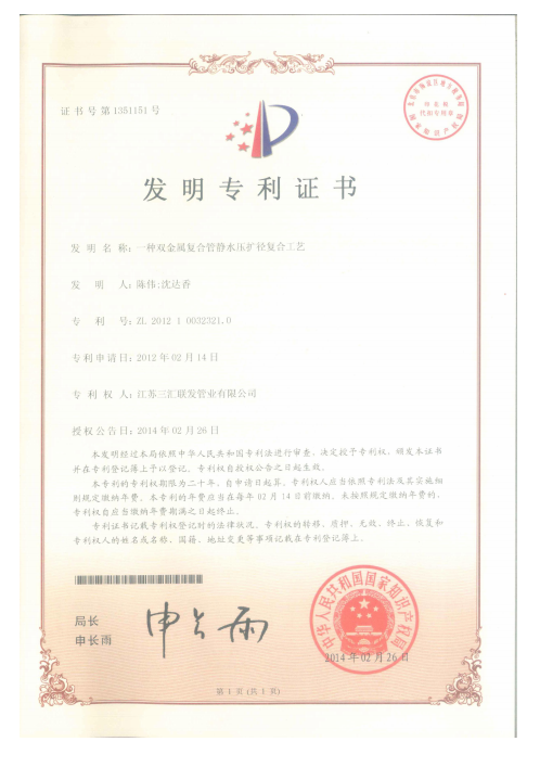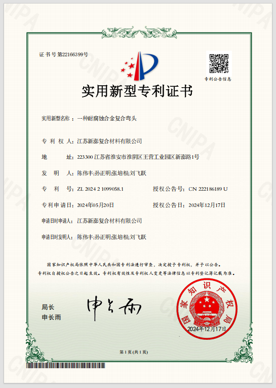 在核心工藝領域,新澎公司以“靜水壓復合+夾層真空”技術為核心,有效解決了大口徑復合鋼管內層鼓包和襯層剝離的行業痛點,開創了超大直徑復合鋼管制造的全新領域,目前已成為“大口徑內襯不銹鋼復合鋼管”制造技術的行業典范。與此同時,公司還積極參與行業標準制定,新澎公司作為國家標準參編單位,持續為行業技術規范發展貢獻力量;并持有特種設備型式試驗證書,為產品質量與安全提供堅實保障。新澎公司憑借突出的技術實力被授予“高新技術企業”稱號。